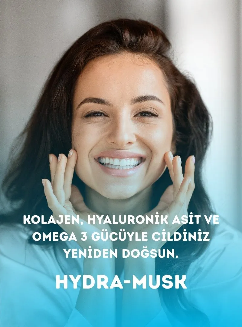 Hydra-Musk, kolajen, hyaluronik asit, omega-3 yağ asitleri ve destekleyici vitamin-mineral kompleksi içeren formülü ile cildin nem dengesini içeriden desteklemeye yardımcı olan kapsamlı bir takviye seçeneği sunar.
