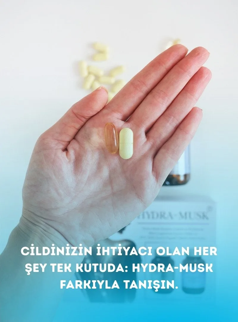 Hydra-Musk, cildin nem dengesini içeriden desteklemek amacıyla geliştirilmiş bir gıda takviyesidir.
