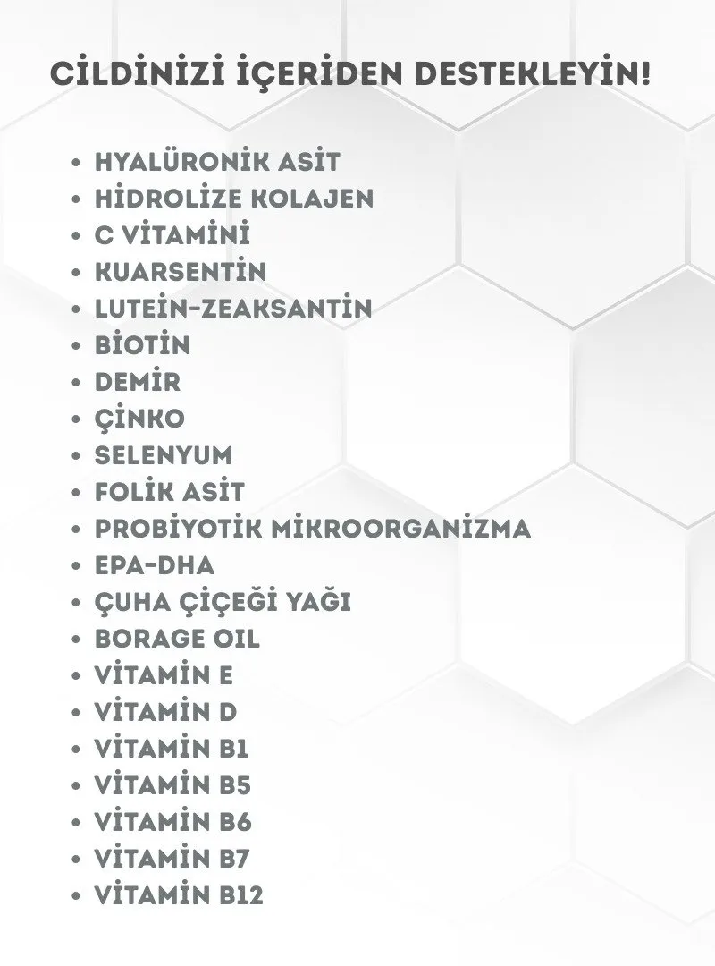 Kolajen, hyaluronik asit ve omega-3 yağ asitleri içeren formülü sayesinde ciltteki su tutma kapasitesinin korunmasına yardımcı olur ve cildin daha sağlıklı görünmesine katkı sağlar.
