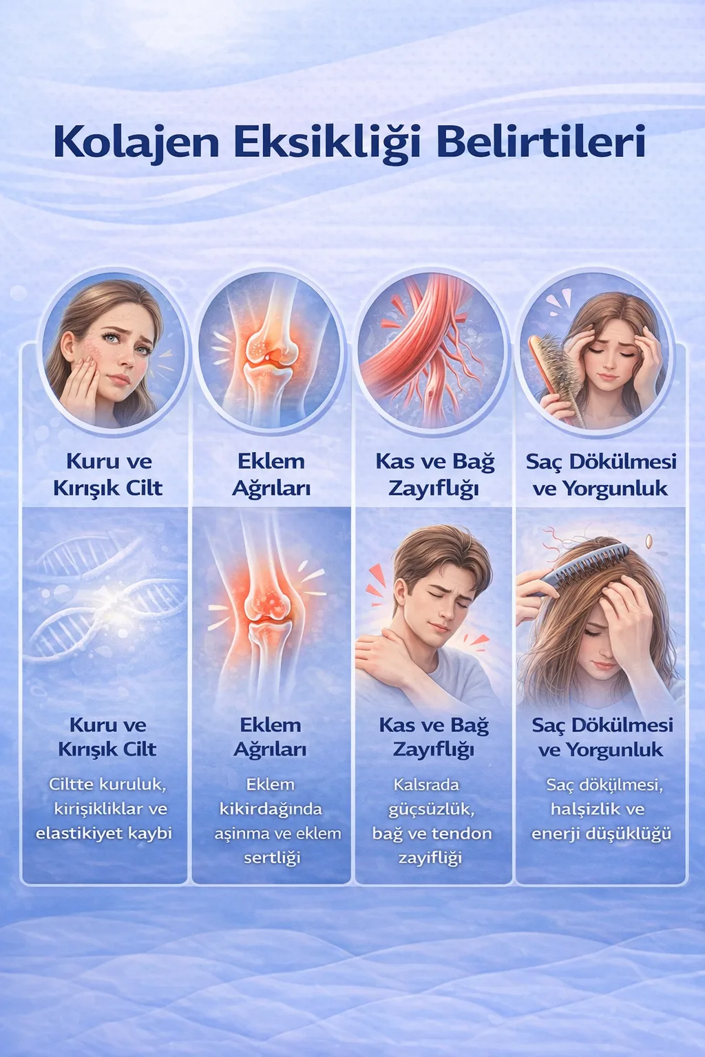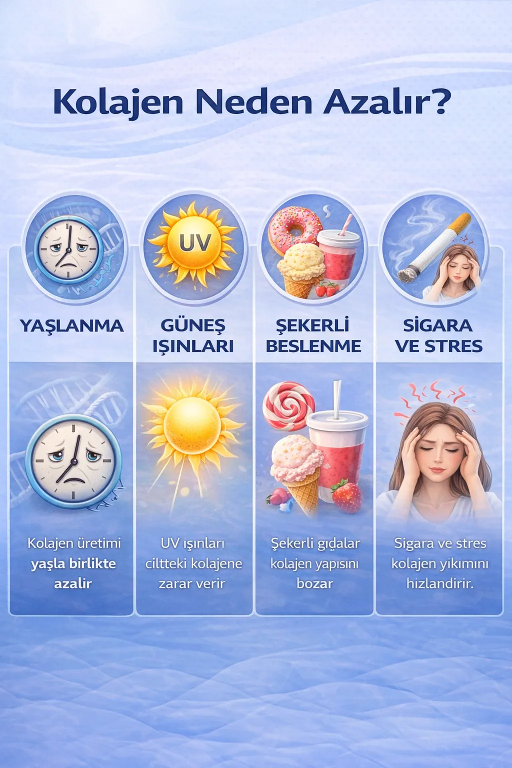 Yaş ilerledikçe vücuttaki kolajen üretimi doğal olarak azalır. Bu durum;